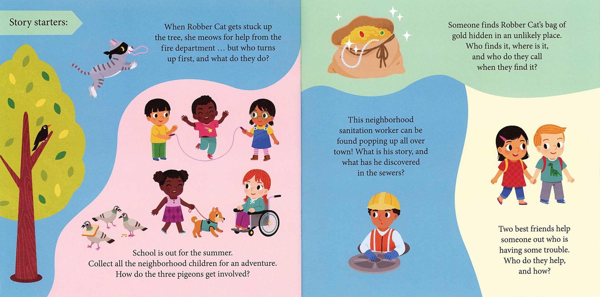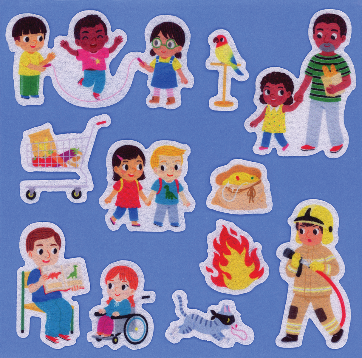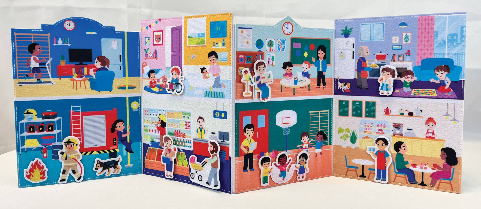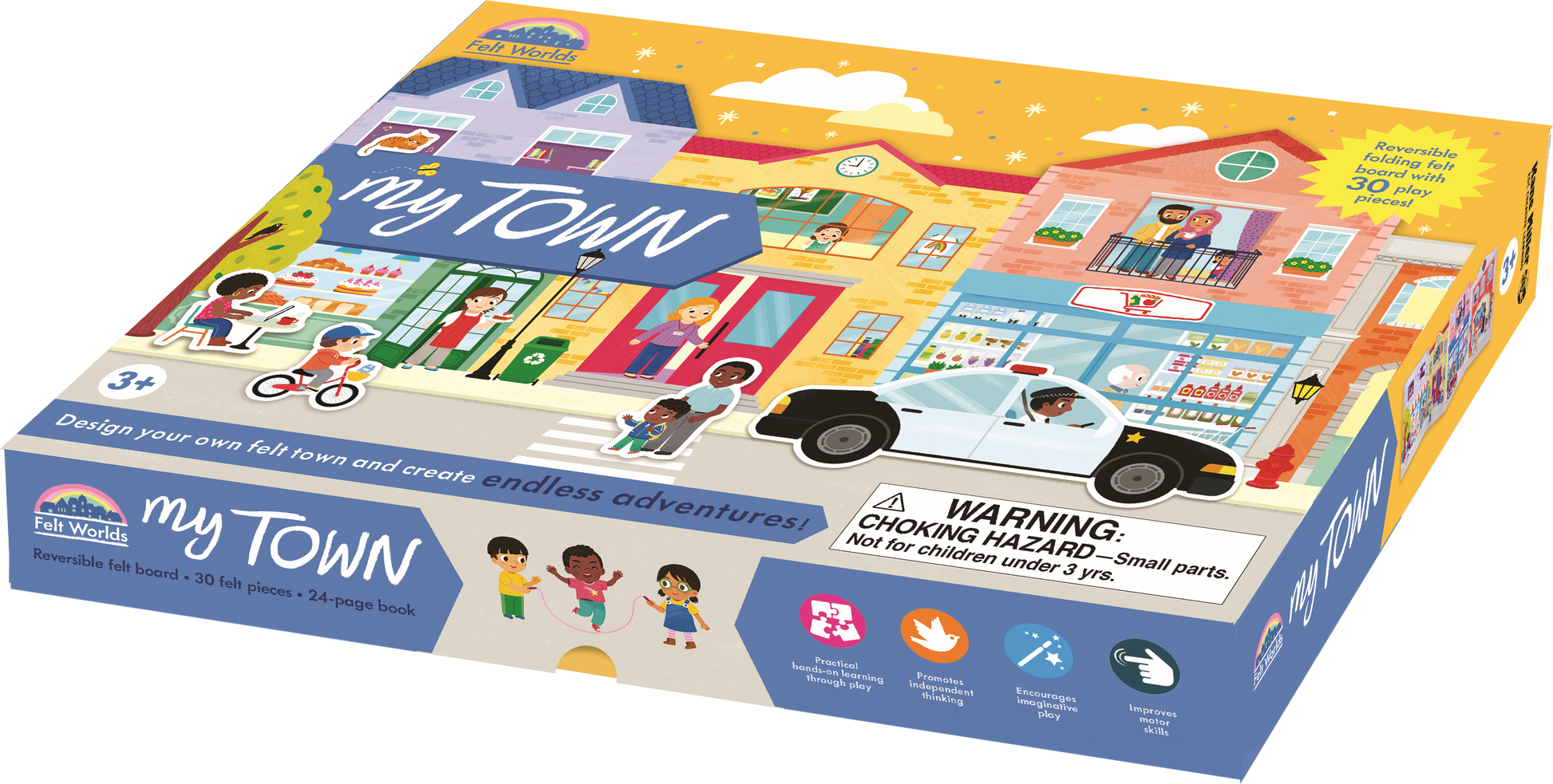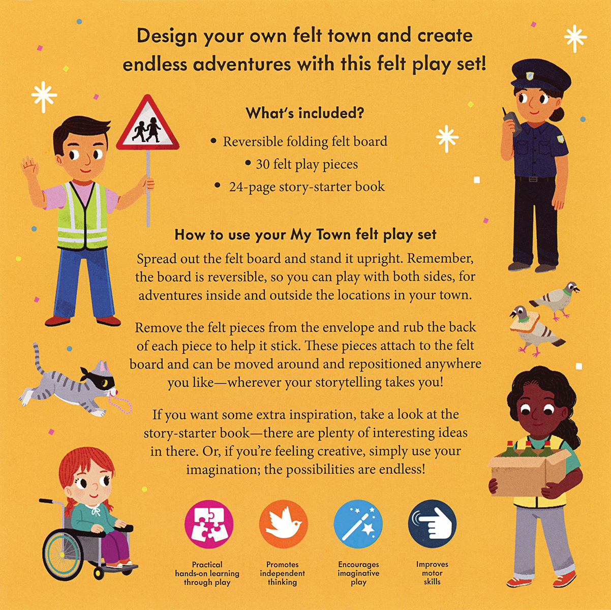 This play set includes a reversible felt board, 30 felt pieces, and a 24-page story-starter book with fun story prompts to encourage imaginative play in and around the felt town.