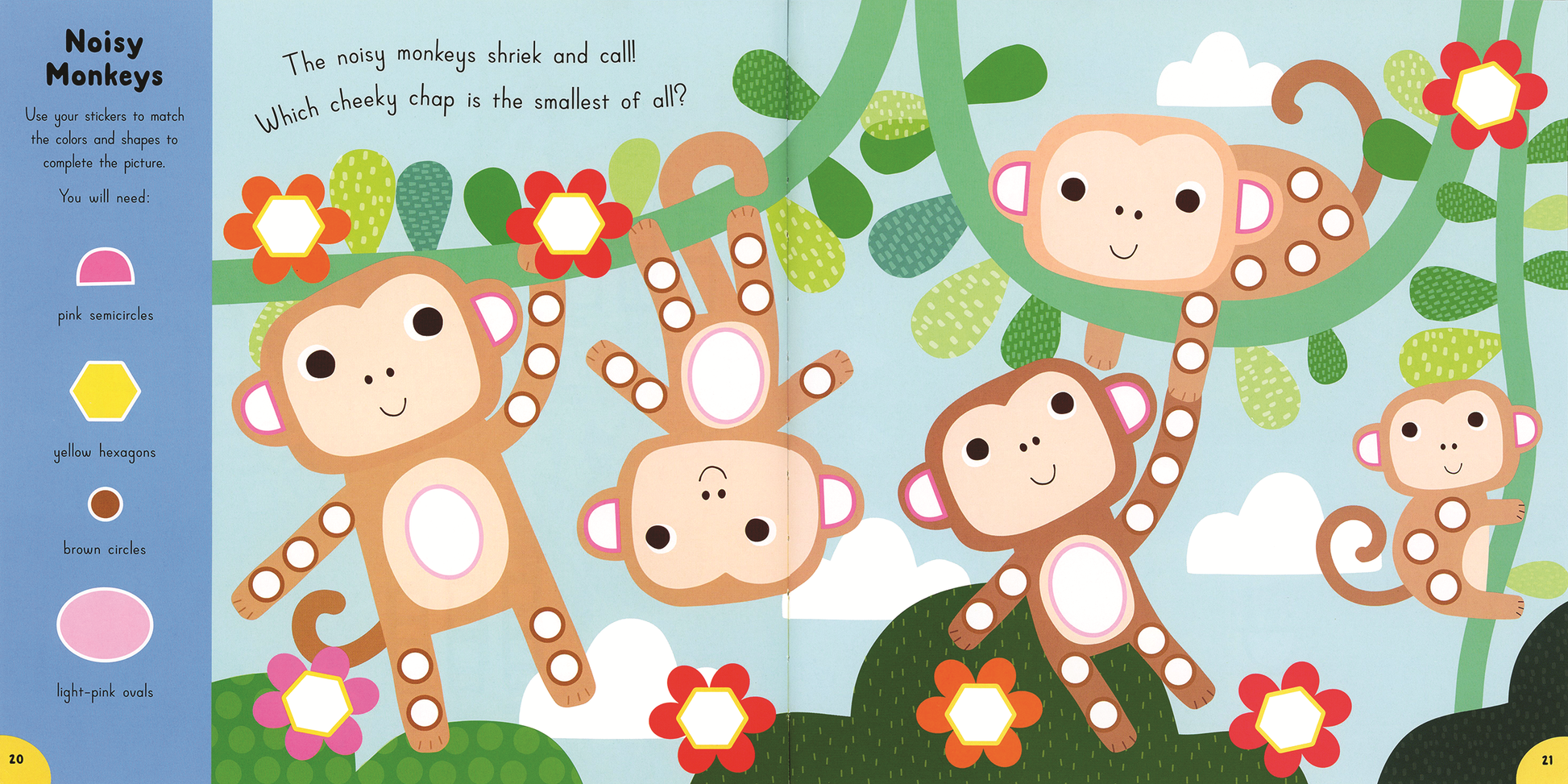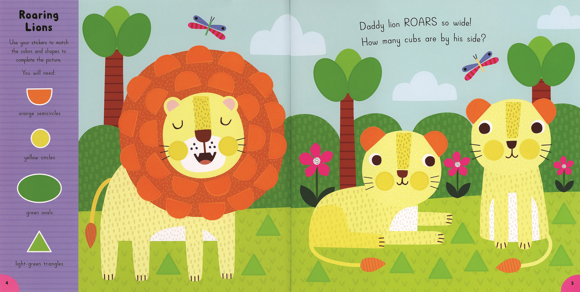 Use the colorful stickers to finish the friendly scenes filled with lions, parrots, monkeys, and more!
