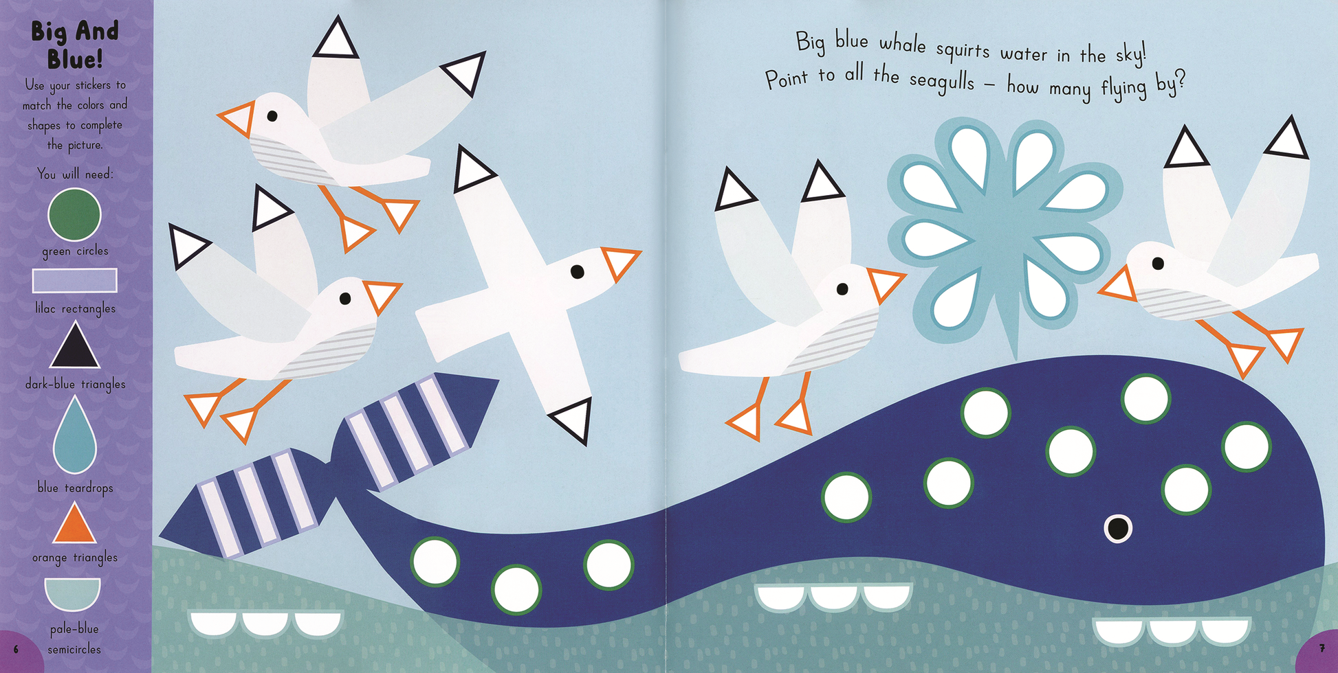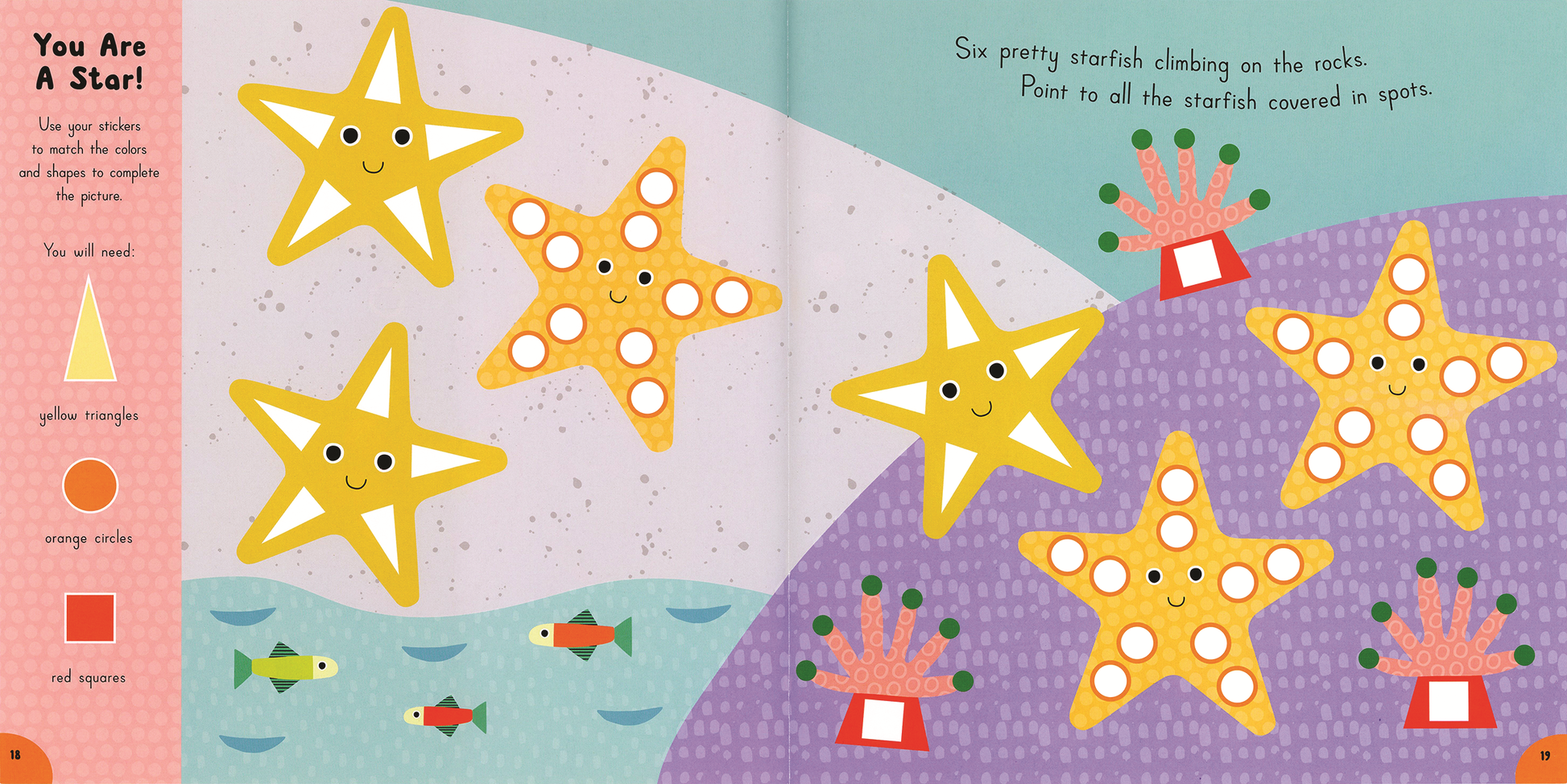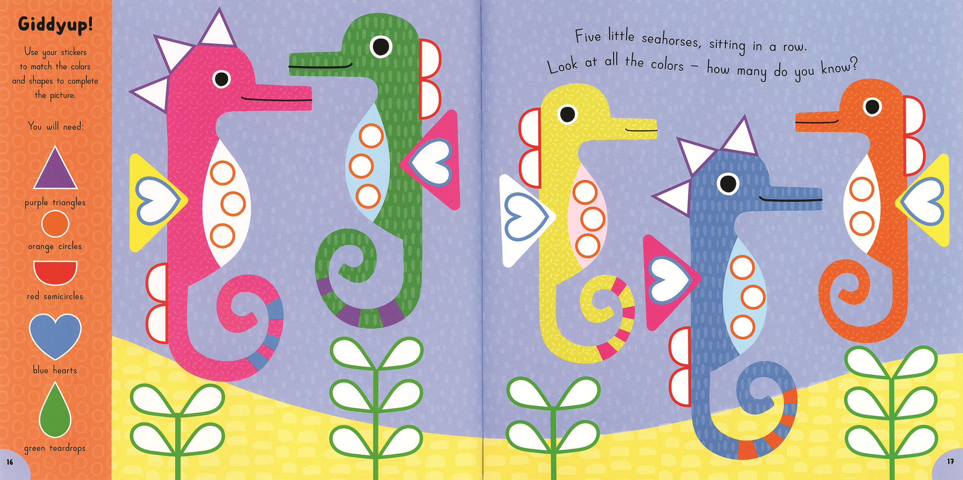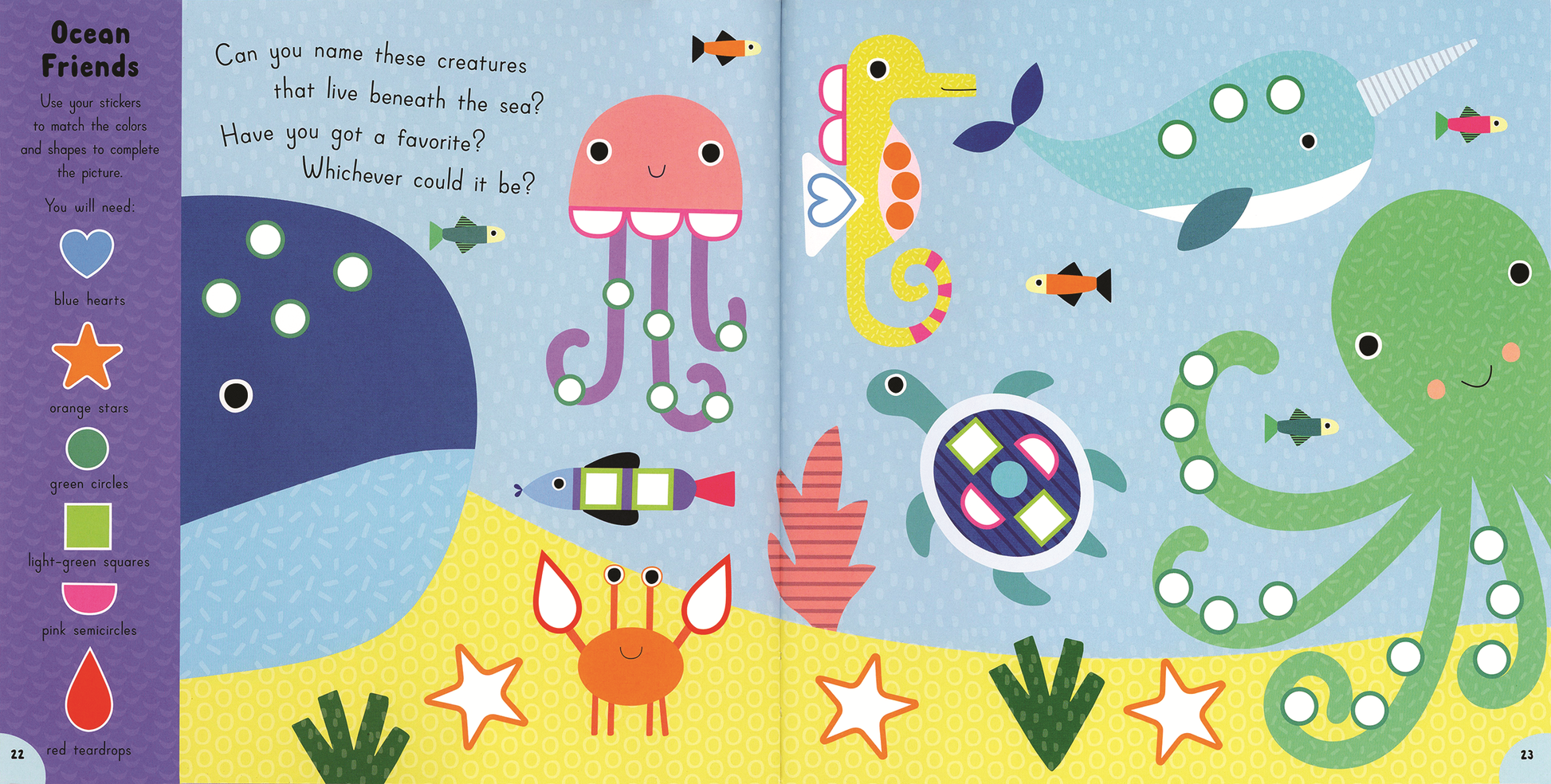 These early learning activity books, with over 500 reusable sticker shapes to match to the pictures, are designed to increase color and shape recognition, as well as support fine motor skills development. Dive into an ocean of fun and use the stickers to match the shapes and colors on the colorful scenes of sea life.